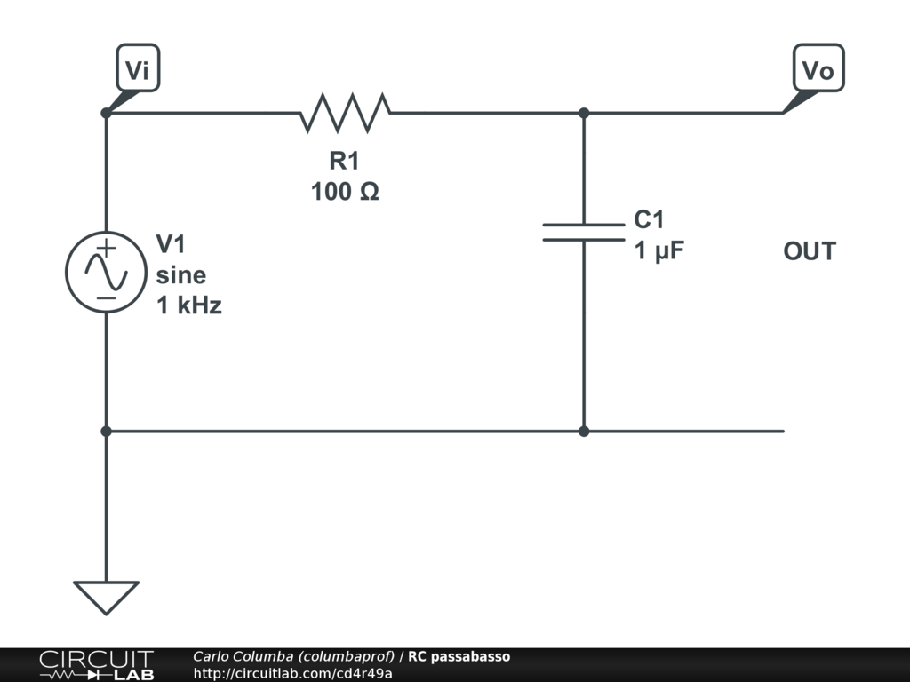 Un elementare circuito RC. Da usare per lo studio iniziale delle reti in alternata e per la risposta in frequenza di un passabasso passivo del primo ordine.