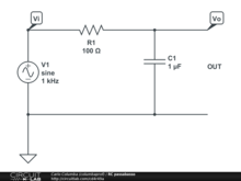 Vengono messe a confronto le tensioni del generatore sinusoidale con quella di uscita prelevata sul condensatore. Le due simulazioni interessanti sono quelle nel dominio del tempo e nel dominio della frequenza. Nella prima si valuta il valore della tensione di uscita e dello sfasamento. E' possibile ripetere più volte la simulazione per diversi valori di R e di C.
