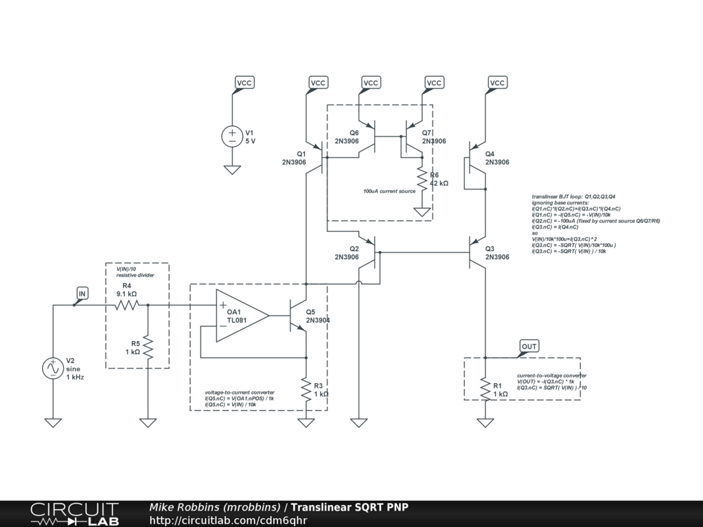 Concept: performs analog square root using the logarithmic voltage-current relationship of BJTs.