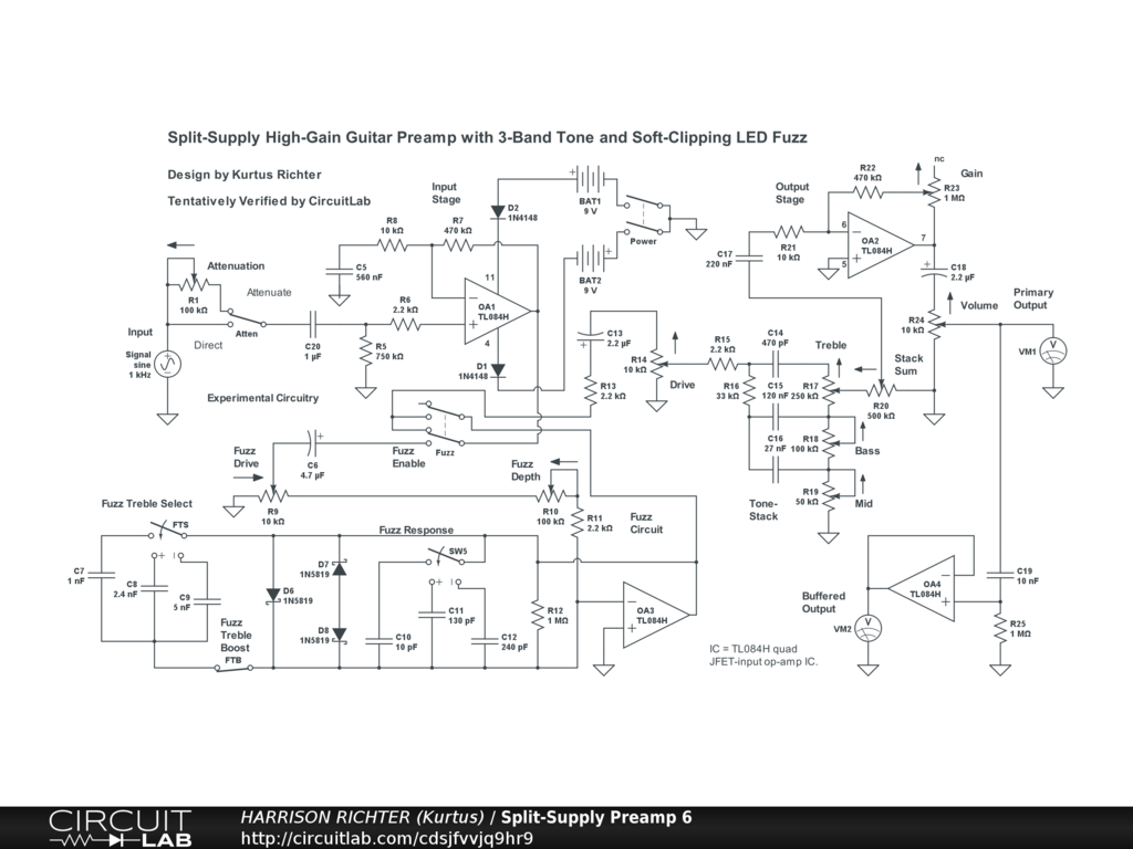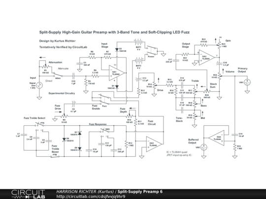 Split-supply guitar preamp with 3-band Fender-style tone-stack, soft-clipping Schottky diode fuzz circuit, and auxiliary buffered output (in addition to normal output). Controls Include: Input Attenuation enable switch (Attenuate or Direct), Attenuation control, Fuzz enable switch, Fuzz Drive control, Fuzz Depth control, Fuzz Response switch (3-position), Fuzz Treble Select switch (3-position), Drive control, Bass, Mid, Treble, Stack-Sum control, Gain, and Volume. Frequency Range: < 25 Hz to > 20 kHz. Suitable for 6/7/8-string guitar and 4/5/6-string bass, but with slight emphasis on the highs. Maximum circuit gain = 24.7 dBV with all controls at 50%. For more gain, to treat circuit as an overdrive, replace 1M Gain pot with a 10M pot, and the 500k Stack-Sum pot with a 250k pot, to obtain maximum gain of 43 dBV.