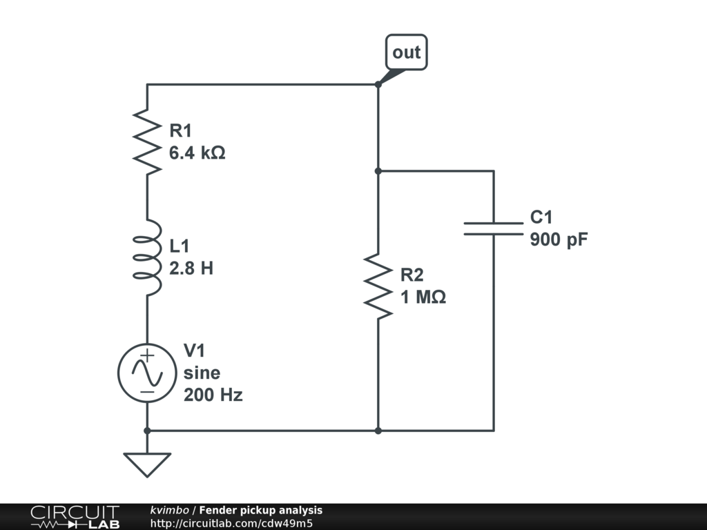 The specs of the pickup are R1, L1. The voltage is set to 100 mV, 200Hz. The load is R2 - potentiometers in the guitar and the input load of tube amplifier. C1 is approximately 3 meter connecting cable with 300pF per meter.