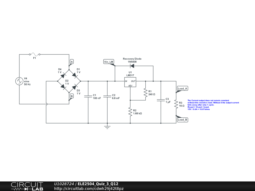 Bridge Rectified Power Supply. Resistive Load required on LM317 output to make output current constant around 0.6A.