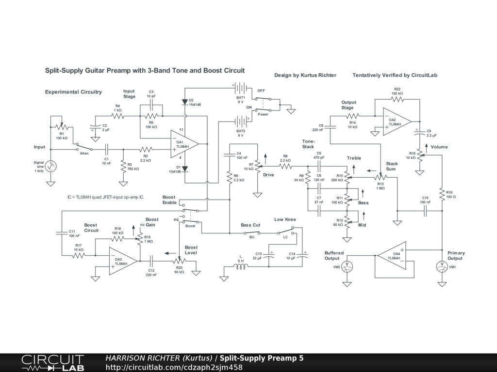 Split-supply guitar preamp with 3-band tone and boost circuit.