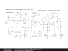 Split-supply guitar preamp with 3-band Fender-style tone-stack, signal boost circuit, and auxiliary buffered output in addition to a normal output. Controls Include: Input Attenuation enable switch (Attenuate or Direct), Attenuation control, Boost enable switch, Boost Gain, Boost Level, Bass Cut switch, Low Knee switch (2 settings), Drive control, Bass, Mid, Treble, Stack-Sum, and Volume. Usable Range: 75 Hz to 16 kHz, with emphasis on mids and highs from 250 Hz to 2.5 kHz. Intended for 6-string electric guitar in standard tuning. Not suitable for 7/8-string guitar or bass-guitar. Maximum circuit gain = 22.5 dBV @ 400 Hz with all controls at 50%. Maximum circuit gain = 28 dBV with Boost Gain control, R19, at 100% but all other controls at 50%. For more overall gain, to use circuit as an overdrive, replace Stack-Sum control, R13, as follows. With R13 = 500k, max gain = 27.5 dBV for R19 at 50%, or 32.6 dBV for R19 at 100%. With R13 = 250k, max gain = 30.2 dBV for R19 at 50%, or 35.5 dBV for R19 at 100%. With R13 = 100k, max gain = 32.2 dBV for R19 at 50%, or 37.4 dBV for R19 = 100%. Do not change other component's values except as needed or desired during breadboard testing.