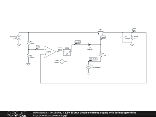 V1 and its PWL (piecewise linear) defined periodic drivetrain is modulated onto the gate of M1. When the output voltage is sufficiently high, the comparator CMP1 output goes high, and the clocked inhibit digital signal goes through the diode D1 to prevent the gate of p-channel M1 from turning on.