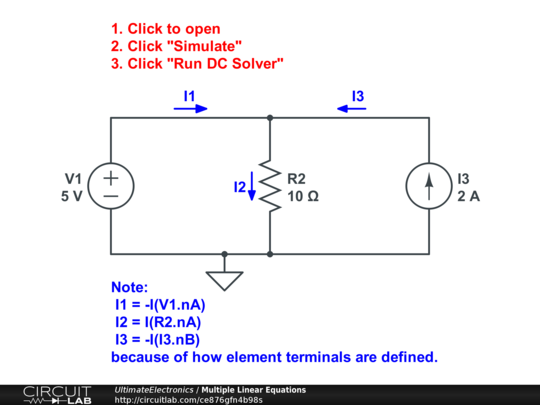 This example is from the Linear & Nonlinear chapter of Ultimate Electronics Book. It illustrates how a simple circuit is turned into a system of multiple linear equations.