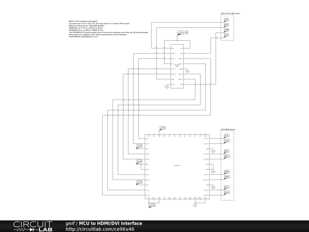 An experimental circuit to drive a DVI/HDMI display from 3.3V or 5.0V TTL at a maximum resolution of 1024x768 @ 60Hz.