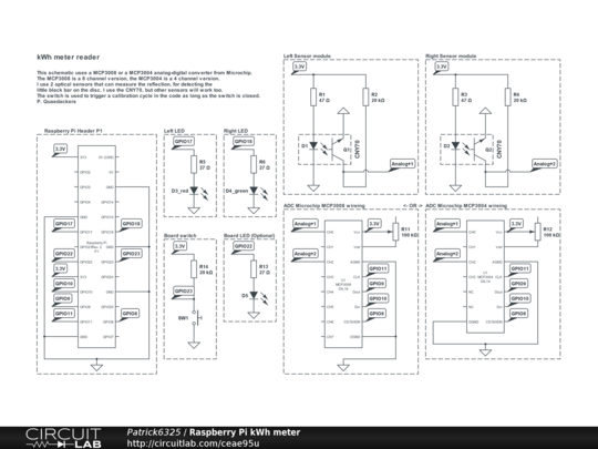 This is the schematic for reading (analog) kilowatt-hour meters. This schematic has two CNY70 sensors to read the "black spot" on the rotating disk. Software will read the ADC converter info and can determine the rotation direction of the disk, and will count the number of rotations.