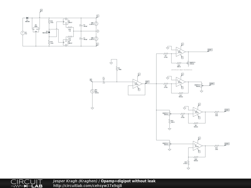 The issue is that digipots have a relatively large wiper resistance and therefore the Send 1 leaks audible signal when pot is at zero (the 680 ohm resister illustrates the floor resistance).