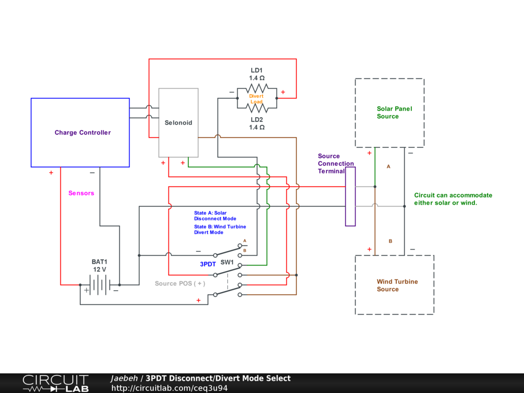 Once wired, the 3PDT switch will generally sit in one position forever unless the charge source (wind, solar) is changed. Such an event only requires the connection of the new source to the same terminals used by the previous source and the 3PDT gets flipped to finish off the change.