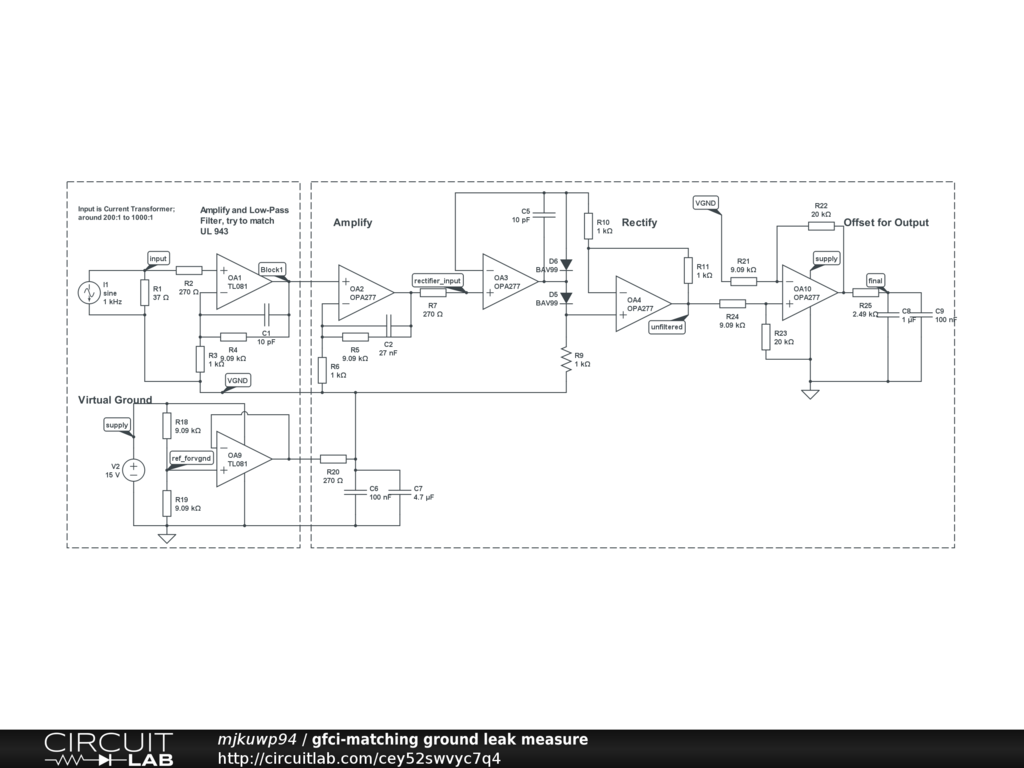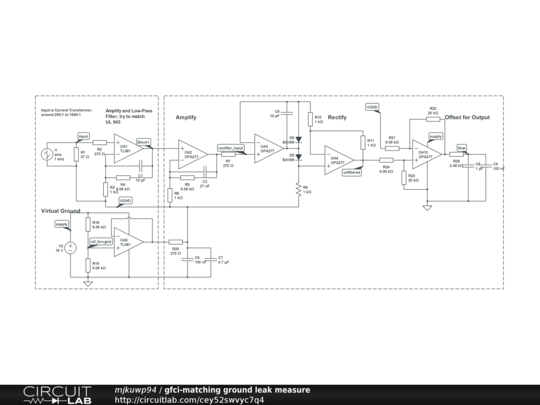 I wanted a way to test how close a device is to tripping a GFCI breaker. This circuit would read a current transformer and then do the required filter. UL 943 specifies the measurement type as rectify, then average. It does not request true RMS measurement.