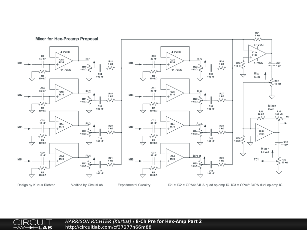 This is the Mixer Section for a Hex-Preamp design shown in three parts; Input Section, Mixer Section, and Output Section. The Mixer is for combining the six signals from the six channels of the Input Section that accepts the six outputs of a hex-pickup (the SubSix from https://submarinepickup.com). It also allows for mixing a Direct and an Auxiliary signal with the six independent string signals. The Input Section includes separate preamp-out outputs for all eight signals, while this Section, the Mixer Section, has only one internal output which feeds the fully mixed signal to the Output Section. However, it also includes a signal booster after the summing-amp. Power-supply not shown. Requires a regulated dual-polarity +-15 VDC power-supply providing up to 50 mA of current. Experimental Circuit! Fully breadboard test before committing to a soldered build. A purpose-designed power-supply is shown on this website. And see the complete Hex-Amp System under "Amplifiers" at https://kurtusrichtersblog.com .
