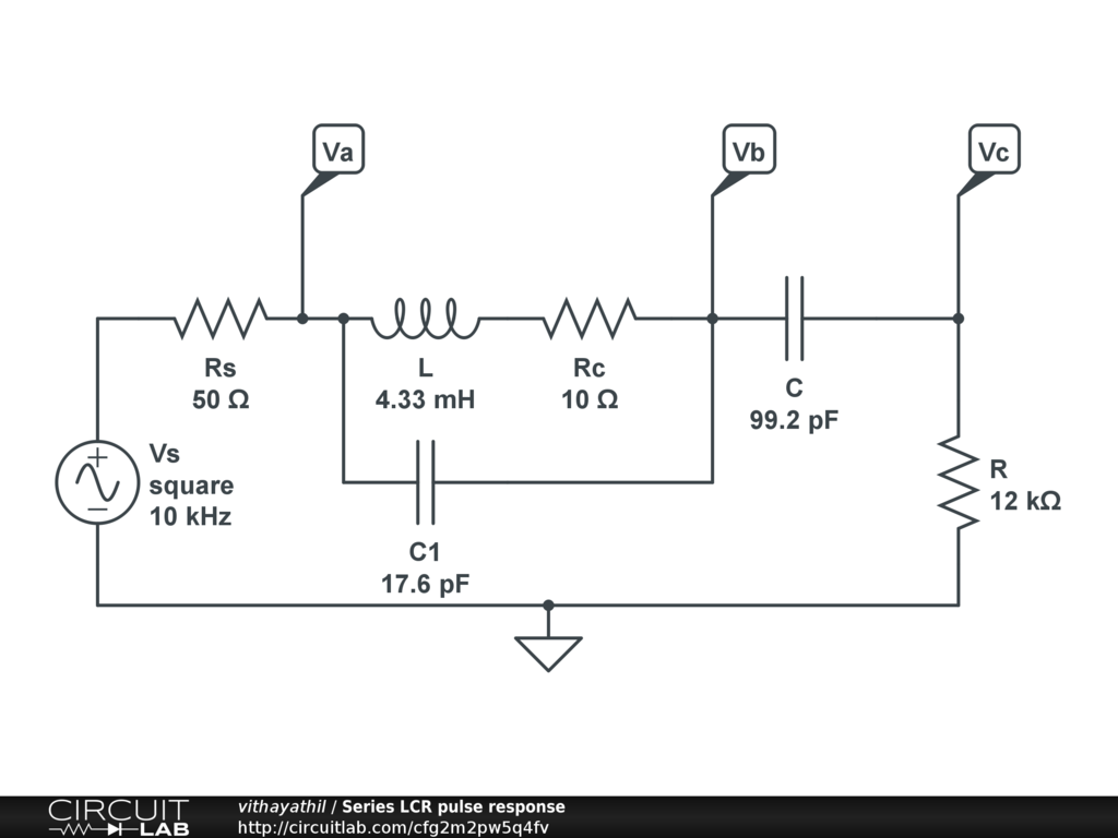 Parallel LCR circuit pulse response. RL is an assumed series resistance at ~ the resonant frequency. Vary R to explore under/critical/over damped cases. R for critical damping is 2sqrt(LC) = ~12kohms.