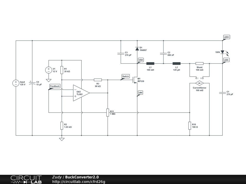 Small Buck Converter controller by a Schmitt Trigger to drive a LED with a stable current.