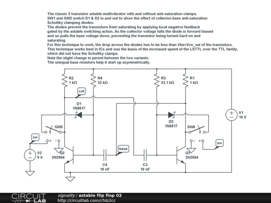 The classic 2 transistor astable multivibrator with and without anti-saturation clamps. SW1 and SW2 switch D1 & D2 in and out to show the effect of collector-base anti-saturation Schottky clamping diodes. The diodes prevent the transistors from saturating by applying local negative feedback gated by the astable switching action. As the collector voltage falls the diode is forward biased and so pulls the base voltage down, preventing the transistor being turned hard on and saturating. For this technique to work, the drop across the diodes has to be less than Vbe+Vce_sat of the transistors.