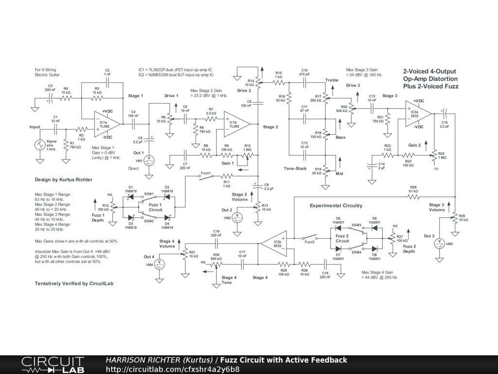 2-voiced op-amp distortion circuit with 2 hard-clipping diode-fuzz arrays and 4 op-amp stages with separate outputs. The op-amp voices are from two types of dual op-amp ICs; one JFET and BJT, both chosen for reputations of providing tube-like distortion when overdriven. One op-amp of each device drives the other op-amp in that IC, with the JFET device as the input IC, so the circuit will accept the directly connected signals from a passive guitar. Stage 1 is a unity-gain voltage-follower, so its output has no volume control. Its range is from 63 Hz @ -9 dBV to 16 kHz @ -12 dBV, but 0 dBV (unity) @ 1 kHz. Stage 2 range is from 40 Hz to > 20 kHz. Stage 3 range is from 40 Hz to 4 kHz. Stage 4 range is from 40 Hz to 16 kHz. Thus, the circuit is ideal for 6-string electric guitar in standard tuning. Controls Include: Drive 1, Gain 1, Fuzz 1 enable switch, Fuzz 1 symmetry switches (two, with 2 positions each), Fuzz 1 Depth, Drive 2, Bass, MId, Treble, Gain 2, Drive 3, Stage 3 Volume, Fuzz 2 enable switch, Fuzz 2 symmetry switches (two, with 2 positions each), Fuzz 2 Depth, Stage 4 Tone, and Stage 4 Volume. All of the following gains are with all controls at 50%. Stage 2 max gain = +23 dBV @ 1 kHz. Stage 3 max gain = +24 dBV @ 160 Hz. Stage 4 max gain = +44 dBV @ 250 Hz, or +49 dBV with both Gain controls at 100% but all other controls at 50%. Power-supply not shown. Requires a regulated supply providing +-9VDC or +-12VDC or +-15VDC at >= 25 mA total current. Though verfied by CircuitLab, treat the circuit as experimental in nature.