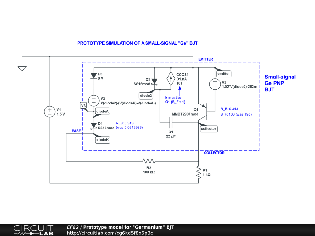 Model. This circuit owes its origins to the technique of current mirrors which link BJTs at the base. For example:- https://www.circuitlab.com/circuit/7f7ge4/bjt-current-mirror/ . This model translates base voltages (at V2) from a "Ge-type" pn junction to those of a Si junction.