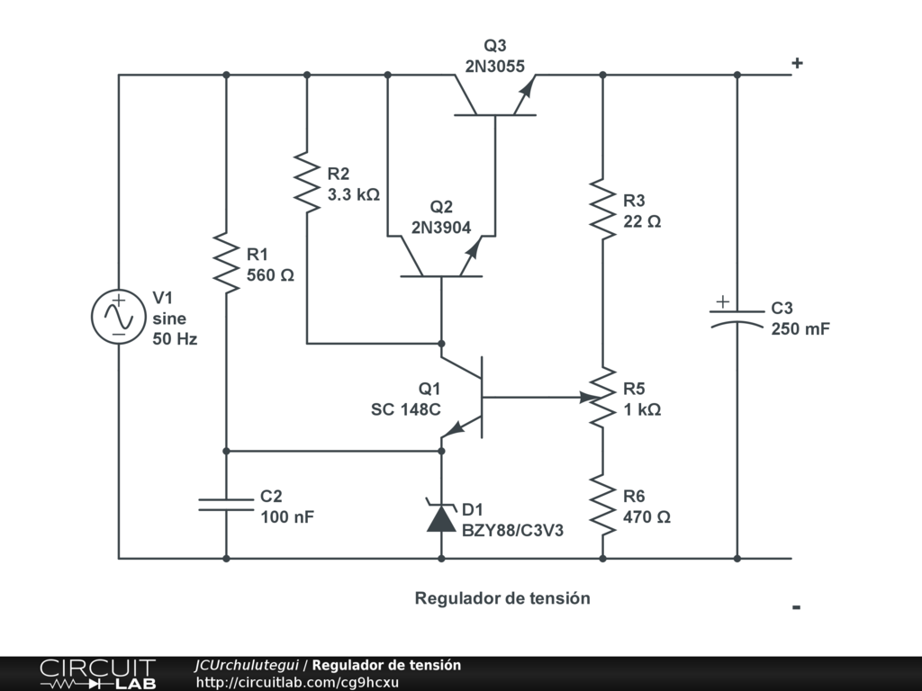 Regula tensión continua de 4 a 9 Vcc, a través del potenciómetro R5, con entrada de 10 Vcc. 1 A.