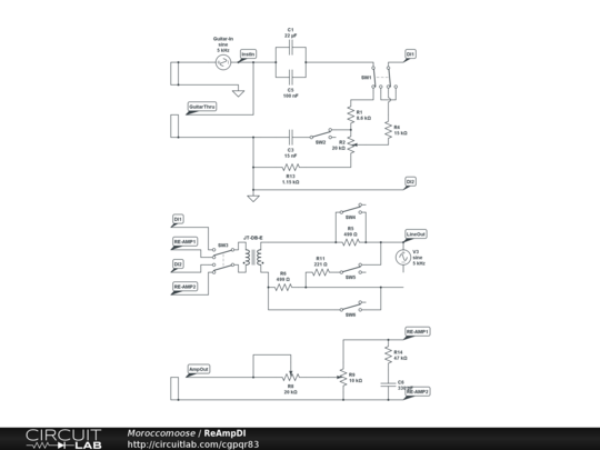 A combined Direct Injection and Re Amping circuit. Converts instrument level high impedance signals to balanced line level signal. Flick the switch and it converts line level back to high impedance instrument level. This allows the the signal from an electric guitar or keyboard to be recorded straight into a DAC without pre amp. Then when it is socially acceptable, you can play the performance into any amp of your choosing.