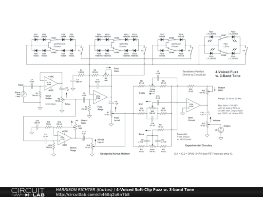 4-voiced soft-clipping fuzz circuit with 3-band tone-control. Controls Include: Drive, Fuzz Gain, Fuzz enable switches (F1, F2, F3, and F4, enabled/disabled separately), Fuzz symmetry switches (eight, with 2 settings each), Fuzz Level, Direct Gain, Direct Level, Bass, Mid, Treble, Output Gain, and Volume. The fuzz voices are as follows. Fuzz 1 from germanium diodes (mellow), Fuzz 2 from Schottky diodes (deep), Fuzz 3 from standard silicon diodes (normal), and Fuzz 4 from red LEDs (bright). Range: 20 Hz - 20 kHz. Circuit suitable for 6/7/8-string guitar or 4/5/6-string bass-guitar. Maximum total gain = 30 dBV (Vo/Vi = 31.6) @ 2.5 kHz with all pots at 50%, or 35 dBV (Vo/Vi = 56.2) with Output Gain pot at 100% but all others at 50%. With all diode arrays disabled, circuit will function as high-gain booster with 3-band tone-control. Power-supply not shown. Requires a regulated dual-polarity supply providing one of the following: +-9VDC or +-12VDC or +-15VDC, at >= 4 mA per op-amp (e.g., 20 mA total).