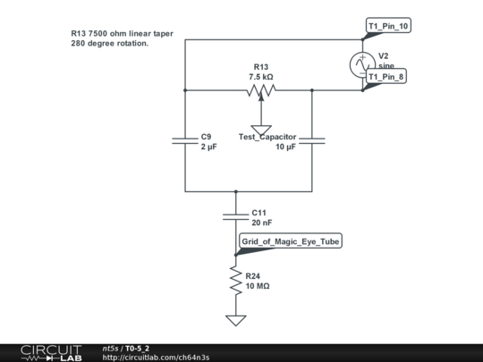 A time domain analysis with varying tap at R13, simulates rotating the dial to get maximum opening of the Magic Eye tube (zero voltage on the grid), indicating the proper value of the test capacitor.