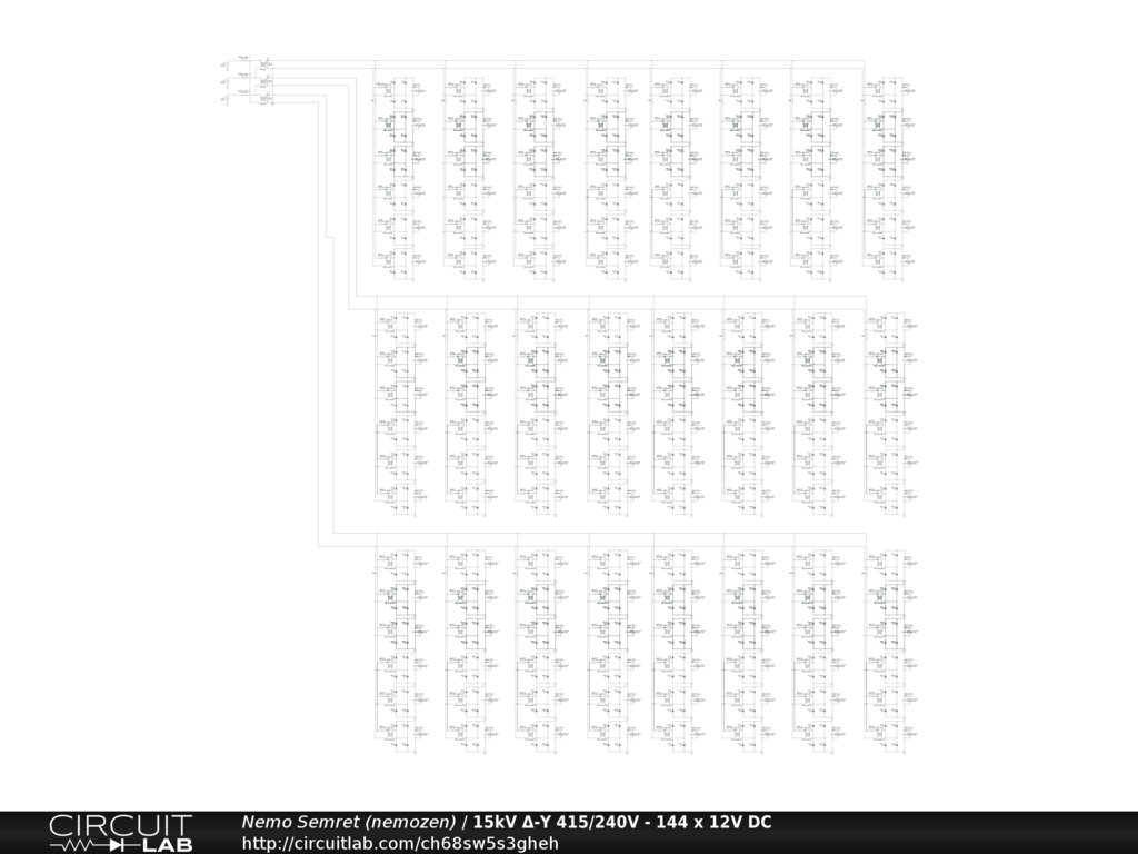 15kV 3-phase delta power input, stepped down to 415/240V wye, supplying 144 machines (48 on each phase), each has as a PSU that converts 240V AC to 12V DC, and consume ~ 3.4kW. In this model, each of the 144 machines is represented by a separate circuit.