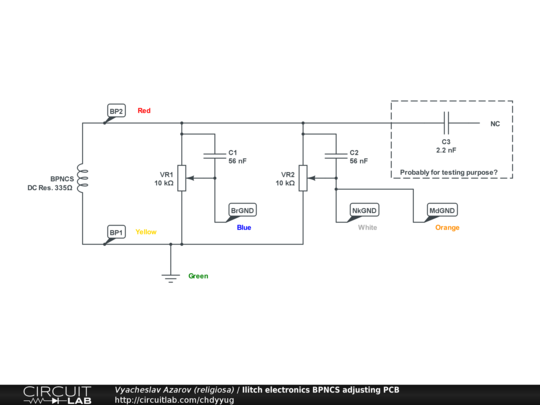 My own tracing of adjusting PCB of ilitch BPNCS noise cancelling system. I'm going to rebuilt it, as I'm not happy with lack of any mounting system on it. PCB number is "32111r4" -- it seems, like this PCB is used for several different style of their noise systems, so some of the pads are not used. It's unclear for me why C3 cap is there -- it's connected only to the metallized hole and pad -- both of them not connected to anything else. Probably it's there for testing purpose, but not really sure. I'm going to omit it my own version.