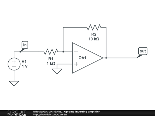 Simple gain -10 voltage amplifier using an op-amp and two resistors.