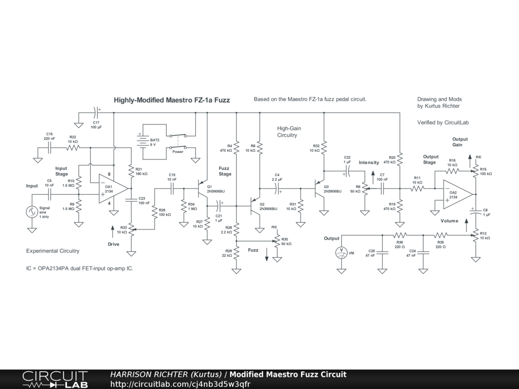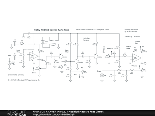 Highly-modified Maestro FZ-1a Fuzz circuit. Controls Include: Drive, Fuzz, Intensity, Output Gain, and Volume. The subcircuit topology involving the BJTs is the original FZ-1a circuitry, while the op-amps were added to include more controls and more gain. No tone-controls. Frequency range between the low and high -3 dBV corners is from 52 Hz to 18 kHz. The range between the high and low 0 dBV points is from 58 Hz to 14 kHz, suitable for 6/7-string guitar (not for 8-string guitar or bass-guitar). Maximum gain = +25.3 dBV (Vo/Vi = 18.4) @ 400 Hz, or +58 dBV (Vo/Vi = 794) between 1 kHz and 2.5 kHz. Thus, this is a high-gain circuit when controls are set > 50%. The originally specified BJTs were the 2N270, but which are obsolete and have been replaced here with the readily available 2N3906BU silicon devices. Op-amps were chosen to ensure clean operation except when the BJTs are overdriven. The circuit is good for stomp-box or rackmount applications, while the battery can be replaced by a regulated single-polarity +9VDC providing >= 50 mA of current. And though simulator verified, treat the circuit as experimental. Breadboard test it before committing to a soldered build. And house in a grounded metal enclosure.