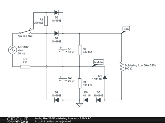 Simple 110V AC to 220V DC converter to power 220V soldering iron without transformer.