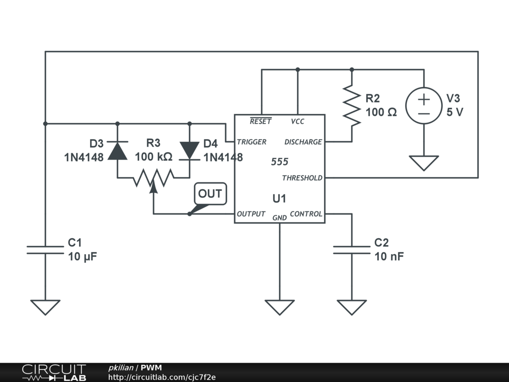 Simple potentiometer controlled PWM with the classic 555 chip. C1 and R3 determine the output frequency, the ratio of R3 controls the duty cycle.