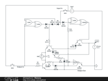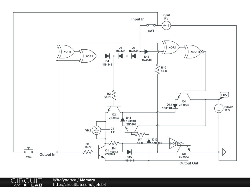 Input charges circuit to be either on or off. If you apply voltage to Output In then you will or will not get current on output out, dependng if there was an initial input on Input In. once output out discharges it automatically replenishes the capacitor to "keep memory".