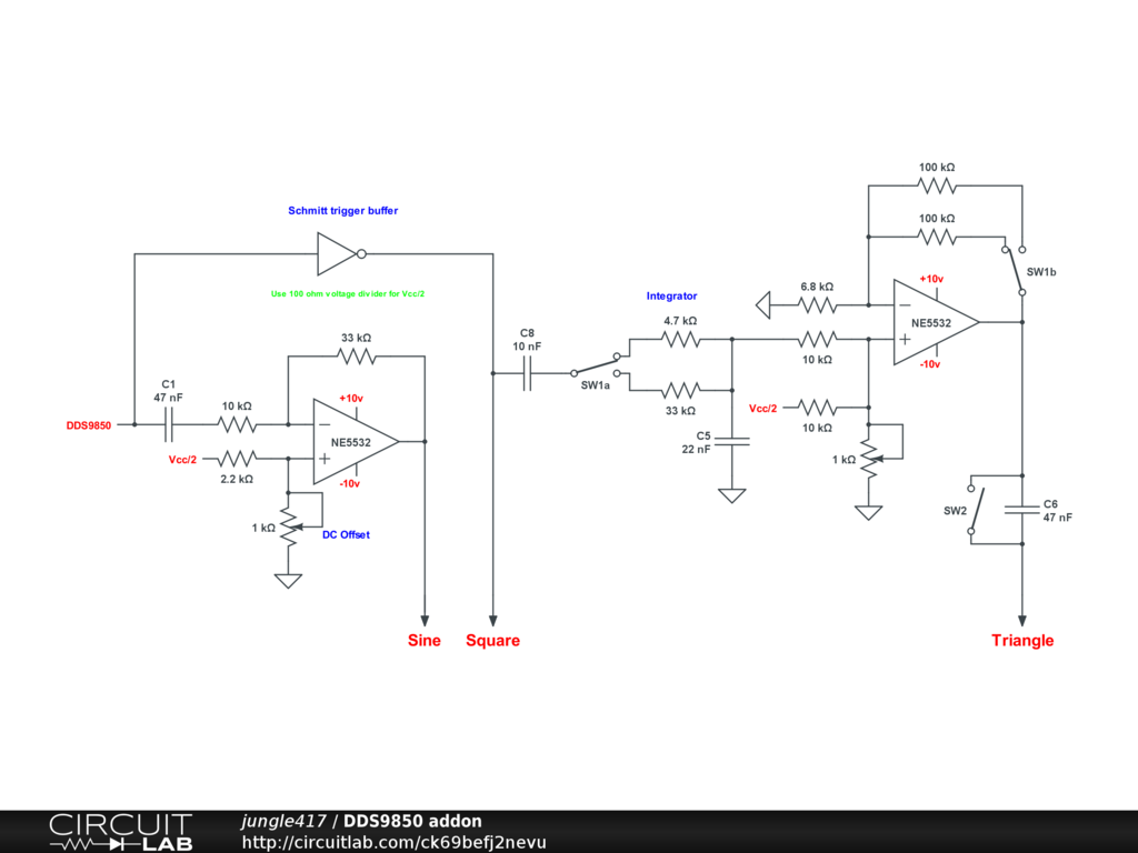 Add on circuitry to a DDS-9850 waveform generator I built some time ago using an Arduino based platform. It provides buffering to isolate the generator from a load, additional gain and the generation of a triangle wave form.