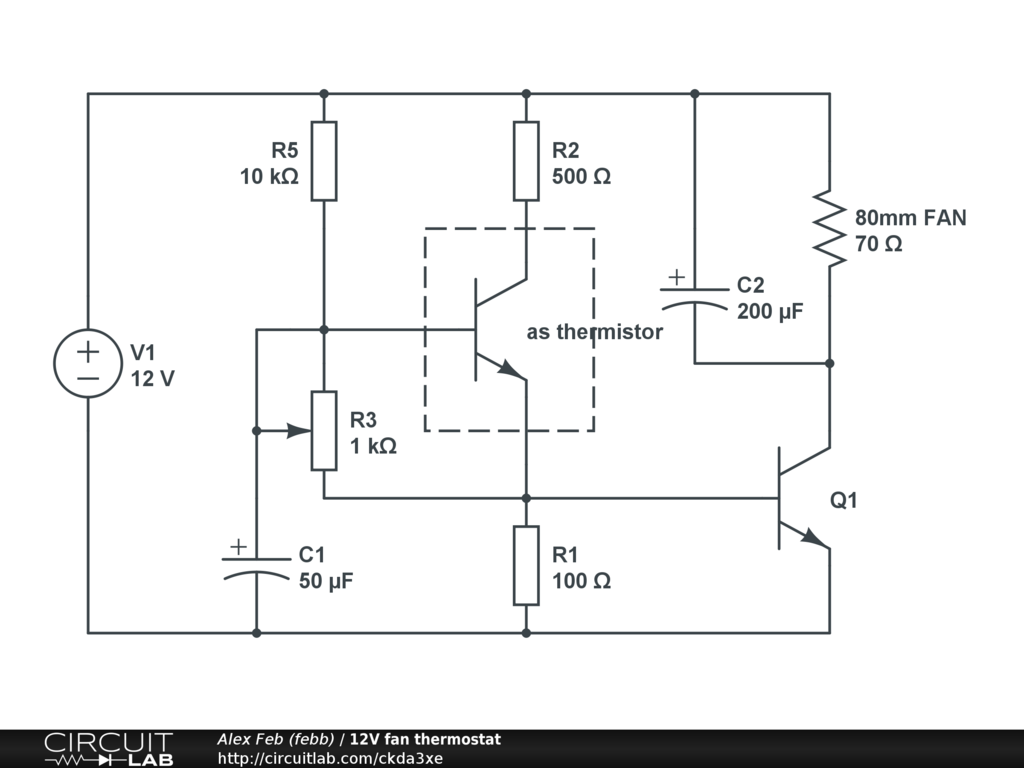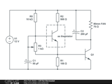 Using transistor as thermistor to control 80mm cooling fan speed.