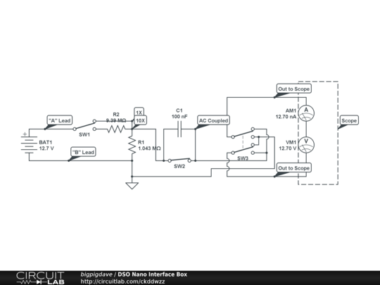 This is a small interface box I put together for my DSO Nano. It provides 4mm banana plug conversion along with 1x & 10x attenuation, AC coupling and lead reversal. I will try to add a picture of the finished project. Please feel free to comment on the circuit and any improvements that could be achieved. Thanks