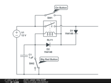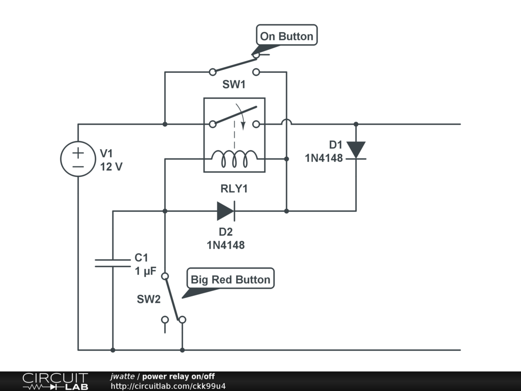 Using low-current momentary push buttons to provide "on" and "off" functionality for a high-current relay. Press "on" once to turn it on; it will stay on. Press "off" once to turn it off; it will stay off. The capacitor guards against temporary mechanical switch glitches during extreme vibration (as may be encountered in a mobile robotics platform.) This circuit should go well with the Big Red Button from Trossen Robotics: http://www.trossenrobotics.com/store/p/6362-Huge-Red-Panic-Fire-Button.aspx and with a 12V / 50 mA coil 30A relay: http://www.digikey.com/product-detail/en/ACNM1112/255-3335-ND/2804726