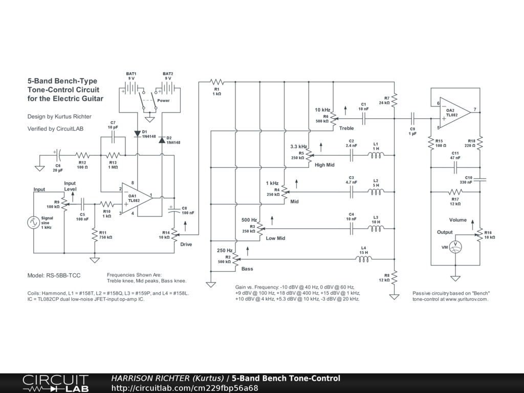 5-band active "Bench" type tone-control circuit for electric guitar. Controls include; Input Level, Drive, 5 tone pots, and Volume. Frequency band centers: 10 kHz, 3.3 kHz, 1 kHz, 500 Hz, and 250 Hz. This is an expensive tone-control circuit due to the cost of the inductors but should have exceptional tonality because of their resonant characteristics. [Parts available from www.newark.com.] Response tailored to 6-string guitar in standard tuning; maximum range if from 80 Hz to 18 kHz. Suitable for stomp-box or rack-mount applications. Batteries can be replaced by a regulated dual-polarity +-9V DC power-supply providing 50 to 100 mA of available current. Though verified, treat the circuit as experimental. Breadboard test before committing to soldered build. Tone control circuit based on 3-band Bench circuit found at https://tonestack.yuriturov.com. Total circuit gains per frequency with all pots at middle positions, and using a 1 V p-p 1 kHz input signal, are; -10dBV @ 40Hz, 0dBV @ 63Hz, +4.5dBV @ 82Hz, +9dBV @ 100Hz, +18dBV @ 400Hz, +15dBV @ 1kHz, +10dBV @ 4kHz, +5.3dBV @ 10kHz, 0dBV @ 16kHz, and -3dBV @ 20kHz. Absolute maximum total circuit gain = +36dBV @ 400Hz. Thus, this circuit emphasizes mids between 82Hz and 10kHz. Ideal for 6-string electric guitar.