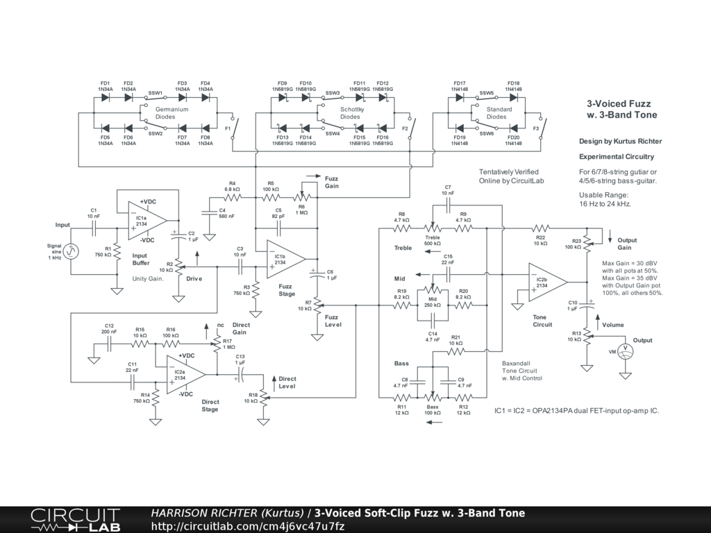 3-band soft-clipping fuzz circuit with 3-band tone-control circuit. Controls Include: Drive, Fuzz Gain, Fuzz enable switches (F1, F2, and F3; separately enabled/disabled), Fuzz symmetry switches (six; 2 per diode array, with 2 settings each), Fuzz Level, Direct Gain, Direct Level, Bass, Mid, Treble, Output Gain, and Volume. Suitable for 6/7/-8-string guitar or 4/5/6-string bass, with emphasis on mids and highs. Usable Range: 20 Hz to 20 kHz. Maximum total gain = 30 dBV (Vo/Vi = 31.6) with all controls at 50%, or 35 dBV with the Output Gain pot at 100%, but all other controls at 50%. Power-supply not shown. Requires regulated supply providing one of the following: +-9VDC or +-12VDC or +-15VDC, at >= 4 mA per op-amp (e.g., 20 mA total).