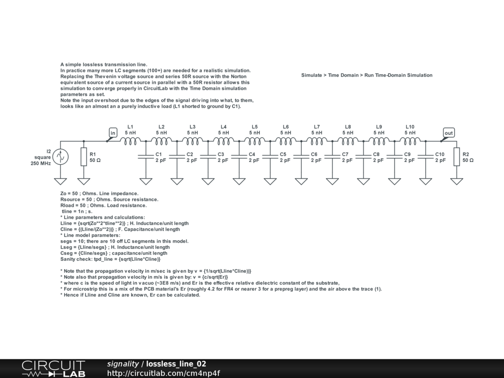 A simple lossless transmission line. In practice many more LC segments (100+) are needed for a realistic simulation.