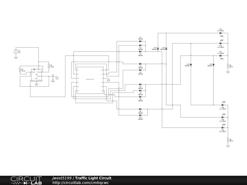 A pretty simple little traffic light circuit using a 4017 Decade counter and a 555 timer for a clock. It can't be simulated because I had to use custom part for the decade counter. It works well though I have it on one of my breadboards right now.
