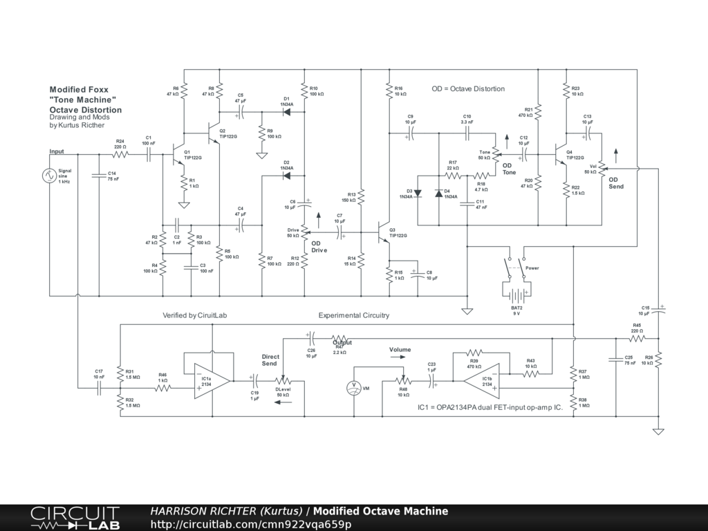 Highly-modified Foxx "Tone Machine" octave distortion circuit. Originally from the early 1970s, later used by the Danelectro company in their DJ13 "Frenchtoast" pedal. Both pedals only available used today. The original circuit in this mod is represented by the discrete BJTs while the modifications involve minor changes to the original circuit plus the addition of the op-amps. Controls Include: Direct Send, OD Drive, OD Tone, and OD Send (OD = octave distortion, not overdrive). The original switch that added octave to the distortion has been eliminated, so the distortion here always includes an octave component, although the distortion and direct signal levels can be adjusted separately. Not high gain. Maximum gain at 1 kHz is +14.7 dBV with Volume at 100% but all other controls at 50%. Yet, due to interaction between filters and active subcircuits, it falls to +11 dBV with all controls at 100%. Intended for 6-string guitar. This circuit is suitable for stomp-box applications but the battery can be replaced by a regulated single-polarity DC supply providing +9VDC at >= 40 mA of current. The original pedal was part of Peter Frampton's signature sound and has also been used by a number of other guitar legends, such as Billy Gibbons of ZZ-Top. And while simulator verified, treat this mod as experimental. Breadboard test it before committing to a soldered build.