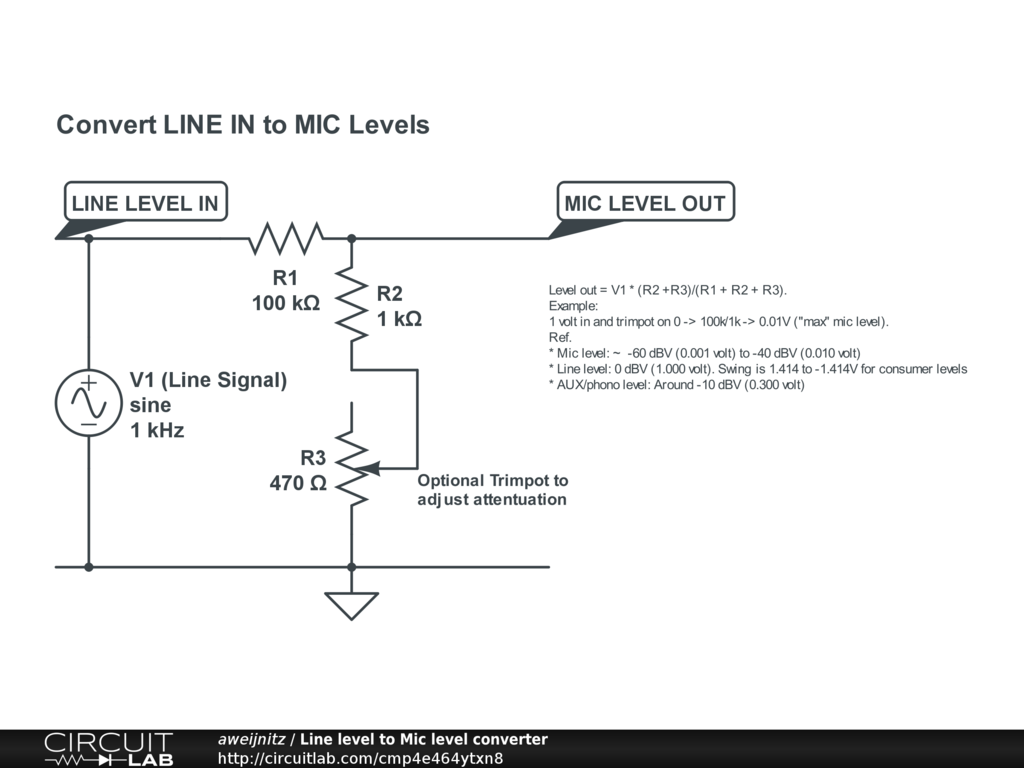 Example: 1 volt in and trimpot on 0 -> 100k/1k -> 0.01V ("max" mic level).