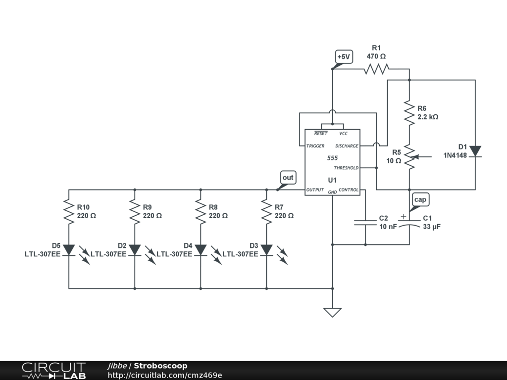 This is a strobe light. Connect an led or a led array to out and gnd and have a party! Or have an epileptic seizure...
