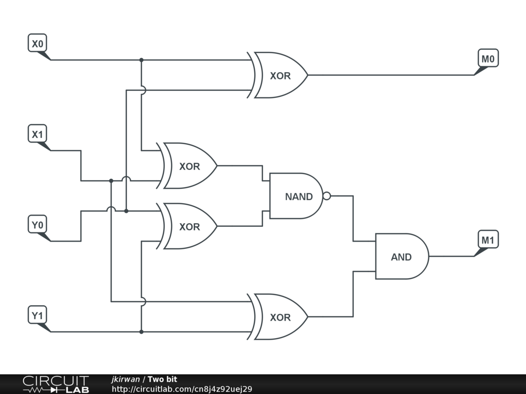 Computes 2-bit | X - Y | given an handful of simple gates. (Not optimized for any particular purpose.)