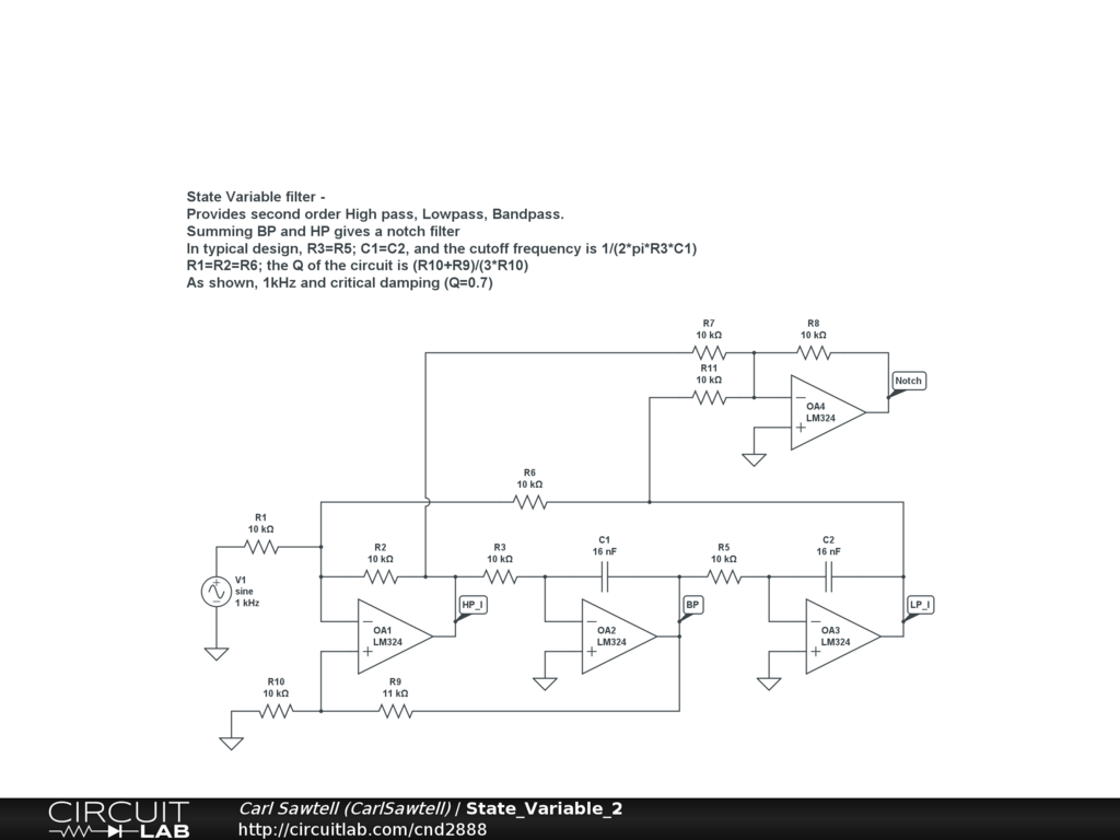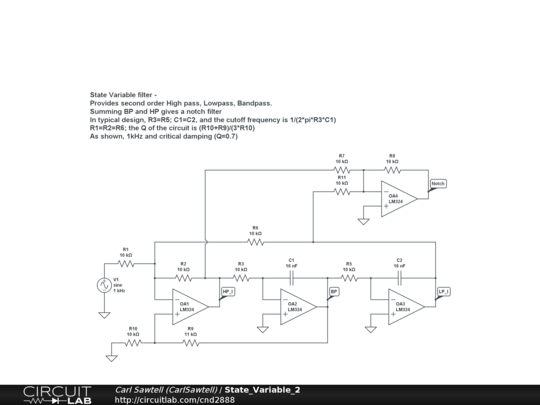 Three amplifier SV filter provides Highpass, Bandpass, and Lowpass outputs; a fourth amp is shown implementing a notch filter.