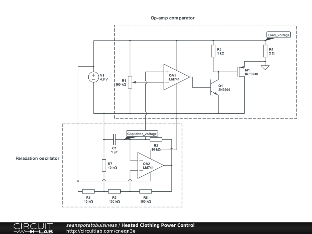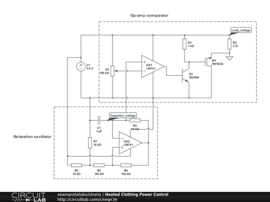 I think you are wasting power in M1. Use a PWM approach to deliver all the power (and therefore heat!) to the clothing and not to the controller). :) See this thread: https://www.circuitlab.com/forums/support/topic/923rgp9z/mystery-component/ for some clues. Different problem but very similar solution. |