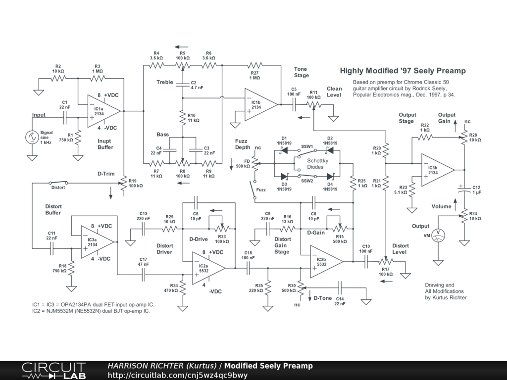 Guitar preamp based on circuit by Rodrick Seely from the article "Chrome Classic 50" guitar-amplifier in Popular Electronics mag., Dec. 1997, p34. However, I imposed many modifications, including adding an extra dual op-amp IC, altering circuitry, and changing part-values to get a preferred response curve. See the original circuit here: https://www.worldradiohistory.com/Archive-Poptronics/90s/97/PE-1997-12.pdf In my version, the controls are: Clean Level, Bass, Treble, Distort enable switch, Distort Trim, Distort Drive, Distort Tone, Distort Gain, Distort Level, Fuzz enable switch, Fuzz symmetry switches (two, with 2 settings each), Fuzz Depth, Output Gain, and Volume. Range at or above 0 dBV is from 22 Hz to 19 kHz, with emphasis on mids and highs. Suitable for 6/7/8-string guitar and 4/5/6-string bass, in standard tuning. Gains depend on whether the Distortion circuit is enabled. Maximum gain without Distortion is +14 dBV @ 2.5 kHz with all controls at 50%, or +69 dBV with all controls at 100%. Maximum gain with Distortion ON is +15.2 dBV @ 1kHz with all controls at 50%, or +69.2 dBV @ 6.3 kHz with all controls at 100%. The Fuzz affects only Distortion; cutting it by 7.1 dB with Depth control at 100% (zero), or by 5.5 dB with Depth at 50% (halfway), or by 3 dB with Depth at 0% (maximum resistance). Power-supply not shown. Requires a regulated dual-polarity DC supply providing +-9VDC or +-12VDC or +-15VDC at >= 60 mA of current. And while based on a proven circuit, plus simulator verified, treat the circuit as experimental. Breadboard test before soldering.