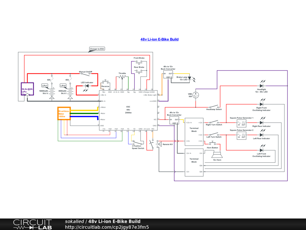 I've physically attempted to complete this 48v (razor mx) build several times over the last couple months and I keep frying components and melting wires. I thought CircuitLab might help by enabling me to test layouts and save myself some failure. Unless I'm missing something, I now don't think the app can deliver what I need, but at least it helped me make a pretty pdf while providing a better understanding circuitry! Anywho, I'm ISO advice to correct, simplify, and improve the layout. |