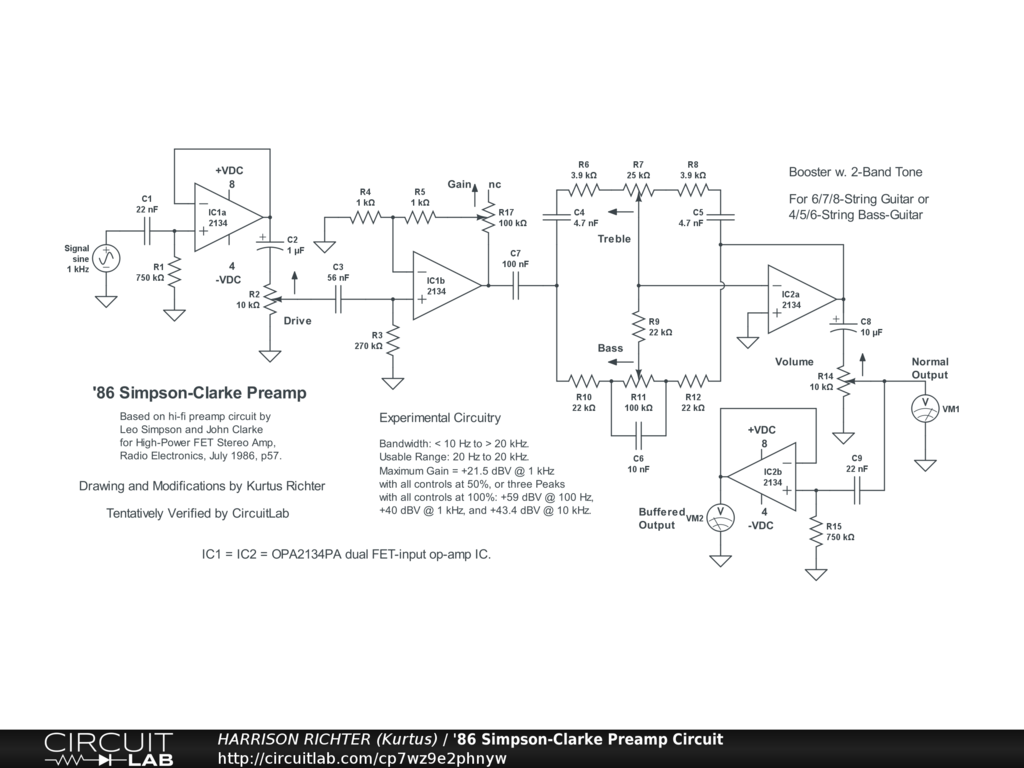 Guitar preamp with 2-band tone that can serve as a high-gain clean boost. Based on preamp for a high-power FET stereo amplifier by Leo Simpson and John Clarke, Radio Electronics mag., July 1986, p57. Modifications include addition of an output buffer and part-values changes. The original can be seen here.