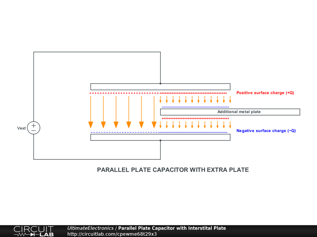 This example is from the Electrons at Rest chapter of Ultimate Electronics Book. It shows a parallel plate capacitor with a third conductive plate being inserted in between the two capacitor plates. The result is charge separation in the 3rd plate and stronger field lines in the area of the third plate.